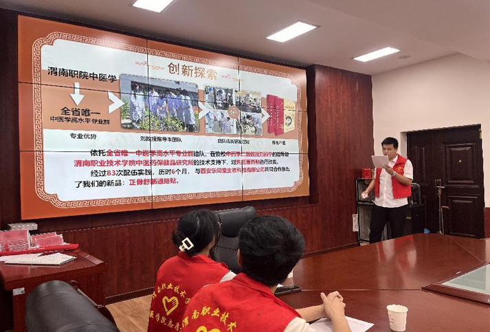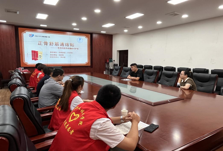 队员毛天炜作为团队代表发言,为荆姚镇的政府干部们介绍了“正骨舒筋通络贴”的原理和治疗作用,让代表们对我们的产品有全新的认识,以便宣传推广,更好的协助“三下乡”活动的开展。