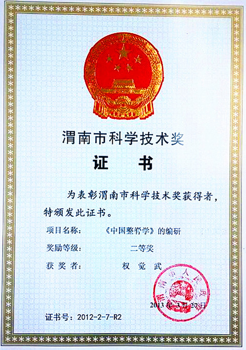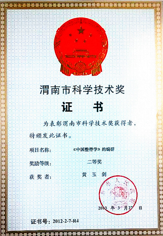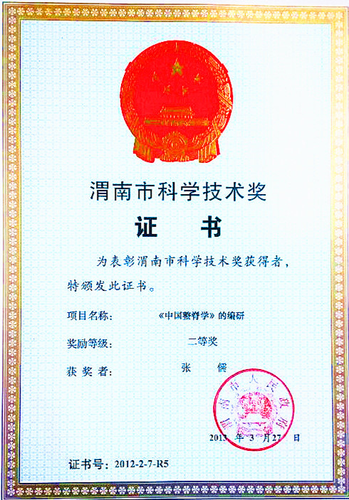公司吕选民、权觉武教授等8名教师编研《中国整脊学》荣获“渭南市2012年度科学技术二等奖”。