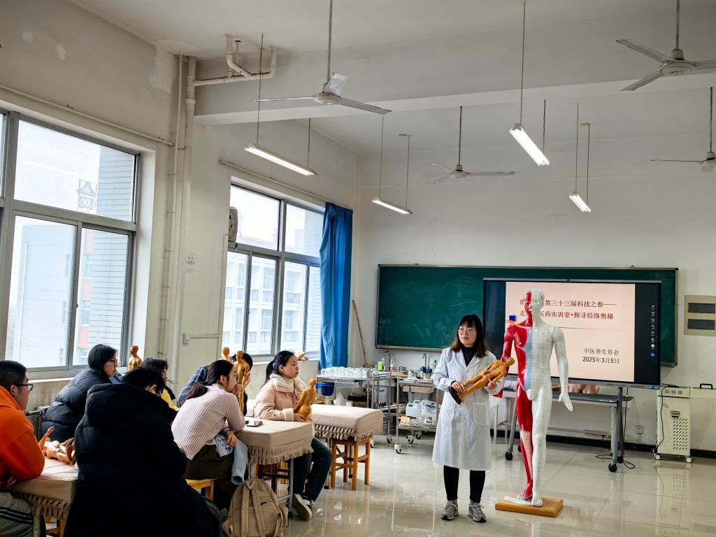 为弘扬中医文化,普及中医养生知识,3月5日,中医养生协会成功举办了“第三十三届科技之春——走进中医药实训室•探寻经络奥秘”活动。本次活动吸引了众多对中医感兴趣的同学参与,现场气氛热烈,大家共同感受了中医的博大精深。